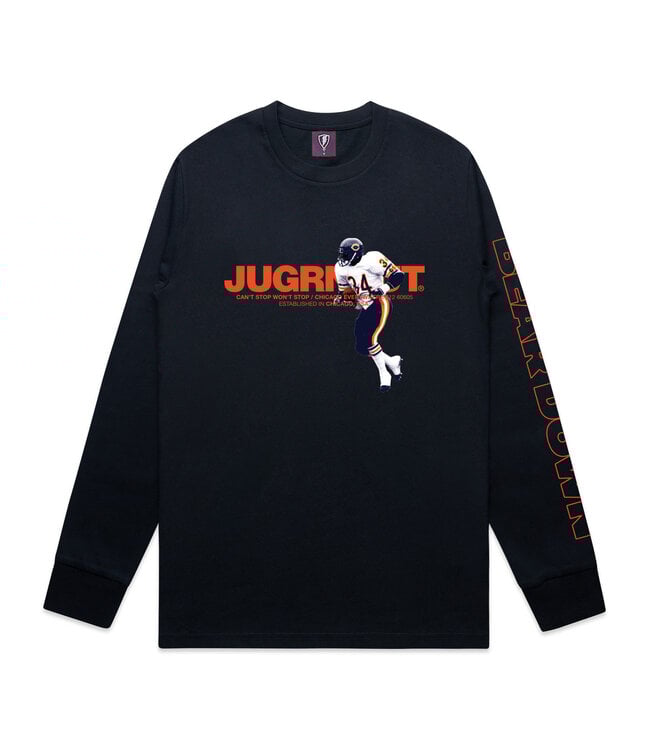 This is a heavy weight 7.5 oz 100% cotton regular fit long sleeve. True to size, screen printed graphic, front back and sleeve.