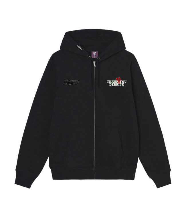 Jugrnaut embroidered Thank You Derrick heavyweight zip up with drawstrings.